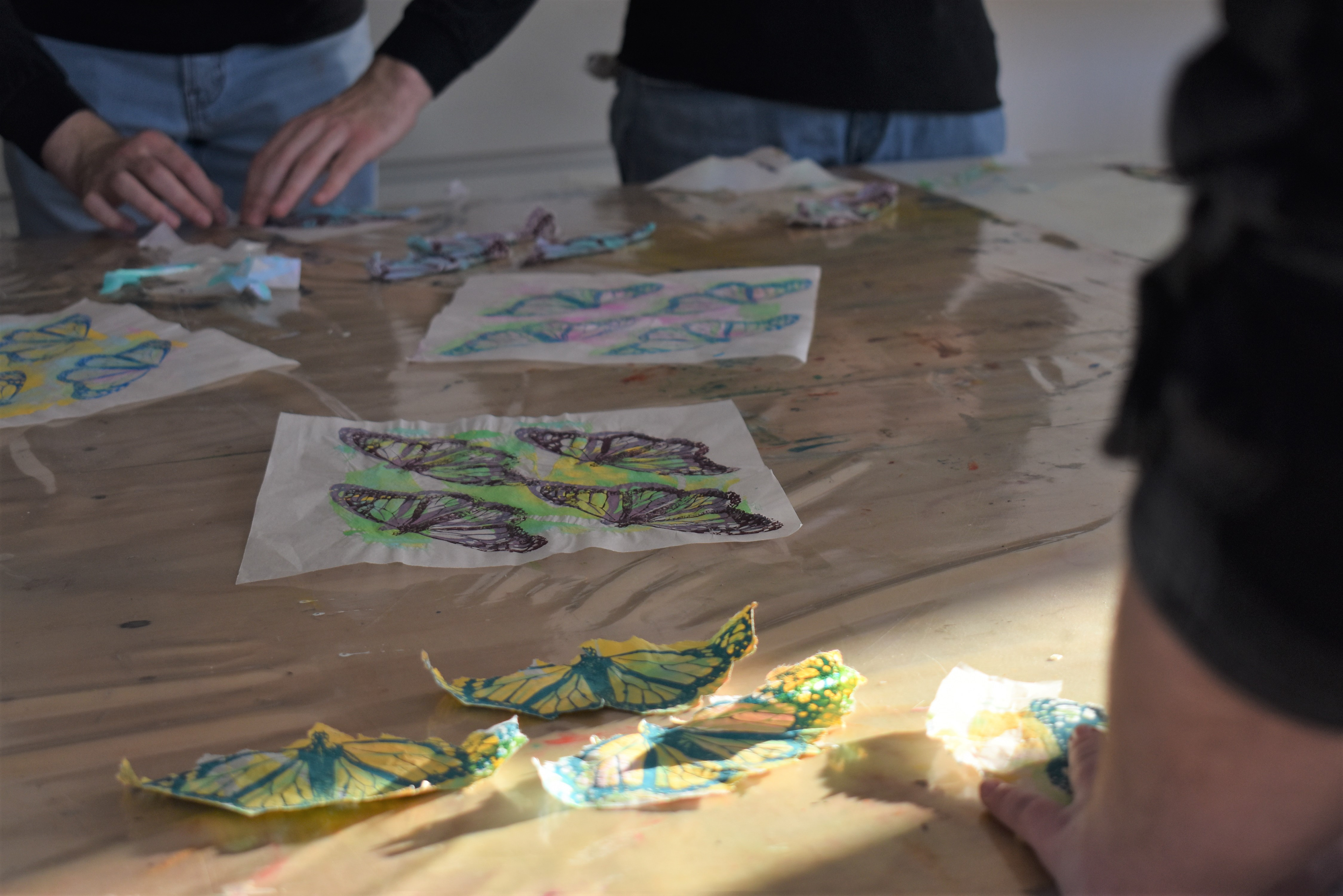 The monarch butterflies we created in these workshops are symbolic of the fragility and resilience of caged migrant children at the U.S.–Mexican border. Embedded in the symbolism is a feeling of injustice and exasperation amid the butterflies’ natural urge to fly, for freedom. The butterfly has come to be endowed with the power to shape public conversations and potentially alter policy and practice. Participants in the workshop reflected on the consequences of migration policies and learned about advocating for children’s mental health while tearing the edges of paper butterflies that would be included in an artistic- expression-as-resistance public art installation.